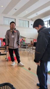 会場内には、けん玉、独楽(こま)、お手玉など計7種の昔遊びブースを設置。指導役としてシルバー人材センターの皆様や有償ボランティアの皆様にご協力いただき、コツを教わりながら真剣に遊ぶ子どもたちの姿が見られました。スタンプラリーを全種目達成した参加者には景品も配布され、会場全体が熱気に包まれました。